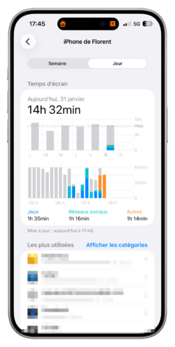 Le problème, c’est que l’utilisation de la fonction En veille entre en ligne de compte des calculs de Temps d’écran, provoquant une utilisation journalière de votre iPhone dépassant parfois les 10 heures. Nombreux sont les utilisateurs d’iPhone à s’en plaindre sur les forums d’Apple, sans qu’un correctif ne soit pourtant apporté par la firme. Il est d’ailleurs impossible de modifier cela dans les réglages. Les deux seules options sont soit de ne plus utiliser En veille, soit de retirer les heures de la nuit et de faire le calcul vous-même…