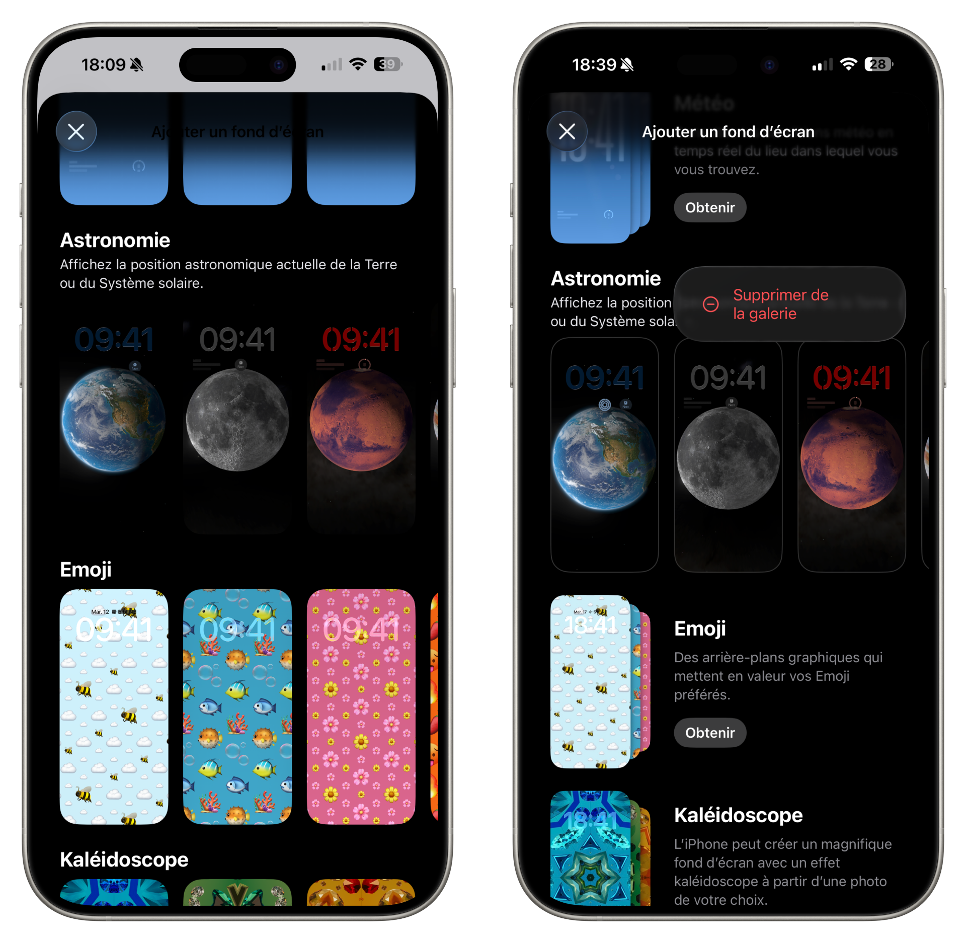 Nouveauté mineure, certes, mais intéressante tout de même : la refonte du menu de fonds d’écran. La galerie adopte une nouvelle mise en page basée sur les catégories identifiées en haut de l’interface. Là où l’interface reposait sur un défilement horizontal des fonds d’écran, on retrouve désormais les catégories résumées que l’on peut développer en appuyant sur Obtenir. Pour alléger l’interface, les collections obtenues peuvent être supprimées.